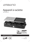 Appareil à raclette GT-SF-RC-01 ans GARANTIE SAV 01 40 82 92 26 (gratuitement) Mail : gt-support @zeitlos-vertrieb.de AN FR 2006050129591 48/2025 NOTICE D’UTILISATION 48/2025 AN FR 2006050129591 PO51033353 ID 1111302850 Sommaire Sommaire 2 Pannes et solutions 19 Généralités Introduction Déclaration de conformité UE Utilisation conforme 3 3 3 3 Maintenance, nettoyage et entretien 20 Données techniques 21 Composants / Contenu de l’emballage Recyclage 22 4 Carte de garantie 23 Sécurité 5 Consignes générales de sécurité 5 Risques pour les enfants et les personnes dont les facultés sont limitées 5 Risques liés à l’utilisation d’appareils électriques 6 Risques liés à l’utilisation de la raclette électrique 7 Explication des symboles et autres informations 10 2 Installation et montage Avant la première utilisation 11 11 Utilisation Utilisation de l’appareil Ingrédients à raclette et recettes 13 13 17 Généralités Introduction Nous vous remercions d’avoir choisi un appareil à raclette électrique Ambiano. Vous venez d’acquérir un produit de qualité qui satisfait aux normes de performance et de sécurité les plus élevées. Afin de manipuler correctement l’appareil et de garantir sa longévité, nous vous recommandons de respecter les indications suivantes. Veuillez lire attentivement cette notice d’utilisation et notamment les consignes de sécurité avant la mise en service de l’appareil. Vous y trouverez un certain nombre de recommandations importantes et utiles qui doivent être comprises et observées par tous les utilisateurs avant la mise en service. Conservez cette notice d’utilisation et donnez-la avec l’appareil si vous le remettez à une autre personne. Déclaration de conformité UE La conformité du produit aux normes prescrites par la loi est garantie. Vous trouverez la déclaration de conformité intégrale sur Internet sous www.gt-support.de. L’appareil répond aux exigences de la loi sur la sécurité des produits. Ceci est prouvé par le sigle GS de l’institut de contrôle indépendant : ID 1111302850 Utilisation conforme La raclette électrique est uniquement destinée à gratiner, griller et rôtir (par exemple : griller sur la pierre de cuisson) des aliments adaptés avec les accessoires fournis. De plus, l’appareil n’est pas destiné à une utilisation professionnelle mais uniquement à une utilisation privée. Il ne peut être utilisé par les employés de magasins, bureaux et autres établissements industriels, dans les propriétés agricoles, ou par les clients des hôtels, motels et autres types d’hébergement comme les chambres d’hôtes. Toute autre utilisation ou modification de l’appareil n’est pas conforme et est strictement interdite. Nous ne pouvons être tenus responsables des dommages survenus à la suite d’une utilisation non conforme ou incorrecte. Éditeur de la notice : Globaltronics GmbH & Co. KG Bei den Mühren 5 20457 Hamburg Allemagne [email protected] 3 Composants / Contenu de l’emballage E F G A H D I I B C A) Plaque de gril, amovible G) Thermostat B) Poêlons à raclette avec poignées isolées thermiquement H) Pierrade I) Poignées (2x) C) Spatule J) Cordon électrique + fiche (non illustrés) D) Surface de pose pour les poêlons à raclette 4 E) Élément chauffant (sous le gril/la pierre de cuisson) K) Notice d’utilisation et carte de garantie (non illustrées) F) Témoin lumineux (en forme d’anneau) Sous réserve de modifications techniques et visuelles. Sécurité Veuillez lire et respecter les consignes de ­sécurité énoncées ci-après. Le non-respect de ces consignes peut engendrer des risques d’accident et de blessures, ainsi que des dommages matériels ou des dysfonctionnements de l’appareil. Consignes générales de sécurité Risques pour les enfants et les personnes dont les facultés sont limitées - Les enfants âgés de plus de 8 ans et les personnes dont les facultés physiques, sensorielles ou mentales sont limitées ou les personnes manquant d’expérience et/ou de connaissances sont autorisés à utiliser cet appareil, à condition qu’ils soient surveillés ou qu’ils aient été instruits quant à son usage sûr et qu’ils aient compris les dangers en résultant. - Le nettoyage et l’entretien de l’appareil ne doivent pas être effectués par des enfants de moins de 8 ans. Passé cet âge, les enfants peuvent réaliser ces opérations s’ils sont surveillés. Les enfants de moins de 8 ans doivent être tenus à distance de l’appareil et du cordon. - Les enfants ne doivent pas jouer avec l’appareil. Les enfants ne sont pas conscients du danger inhérent à l’utilisation d’appareils électriques. Par conséquent, utilisez et conservez l’appareil hors de portée des enfants de moins de 8 ans. Ne laissez pas pendre le 5 cordon électrique afin d’éviter que quelqu’un ne tire dessus. - Conservez l’emballage hors de portée des enfants – Risque d’asphyxie ! Risques liés à l’utilisation d’appareils électriques - Branchez l’appareil uniquement sur une prise secteur avec terre, installée de manière conforme et dont la tension de secteur respecte la plaque signalétique. - Si le cordon électrique est endommagé, seul un atelier spécialisé désigné par le constructeur est autorisé à le remplacer afin d’éviter tout risque de blessure, d’accident ou de dégâts à l’appareil. - Veillez à ce que la prise secteur se trouve à proximité de l’appareil et soit facilement accessible de façon à ce que l’appareil puisse être rapidement débranché en cas d’accident. - Seuls des ateliers spécialisés et habilités sont autorisés à effectuer les réparations. Les appareils réparés par un personnel non spécialisé représentent un danger pour l’utilisateur. - Ne laissez pas l’appareil sans surveillance pendant qu’il fonctionne afin d’éviter tout accident. - Afin d’éviter tout accident, n