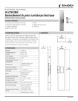 Serrures Électrifiées, relais et minuteries. CX-EPD1289L Déclenchement de jante à précharge électrique INSTRUCTIONS D’INSTALLATION UL 1034 UL 294 CE PAQUET COMPREND: (2) Connecteur d’alimentation à 4 broches (1) Connecteur d’état de porte à 3 broches (1) Gabarit d’installation (4) Vis 1/4 - 20 x 1-1/4’’ UL10C/ CAN4-S104, 3hr. Fire rating (1) MOV (1) Plaque de recouvrement (4) Vis M3 x 6 1. DESCRIPTION GÉNÉRALE 3. DIMENSIONS Camden CX-EPD1289L Précharge de verrouillage de cadre RIM pour loquets Pullman offre la meilleure qualité et performance de verrouillage. La conception du verrouillage offre une flexibilité d’application inégalée, avec une tension sélectionnable sur le terrain, un fonctionnement à sécurité d’ouverture ou de fermeture et un ajustement mécanique du corps de verrouillage.. 3'' 4 [20 mm] 2. SPÉCIFICATIONS Tension 12/24V AC/DC Consommation de courant 560mA à 12 VDC 280mA à 24 VDC Force statique 1,500 lb (vérifié UL) Force dynamique 70 ft-lbs. Précharge (fail-sécurisé uniquement) 15lbs. Durée de vie 1,000,000 cycles (Testé en Usine) 500,000 cycles (Vérifié UL) Projection du loquet 3/4” Classification contre l’incendie UL 10C/CAN4-S104 heures (fail-sécurisé uniquement) Mode Sélectionnable sur place fail-safe/fail-sécurisé Ajustement mécanique Corps de gâche Fonctionnement AC - sonore, DC - silencieux Charge de travail Continue Surveillance du loquet SPDT, 100mA à 24V DC Résistif Dimensions (corps) 9-3/16”H x 1-15/16”Wx 3/4”D (233mm x 49mm x 20mm) Niveaux de performance UL 294 - Sécurité de ligne = Niveau I - Niveau d’attaque = Niveau I - Niveau d’endurance = Niveau IV - Alimentation de secours = Niveau I 115 16'' [49 mm] 115 16'' [49 mm] 3'' 4 [20 mm] 3'' 4 [20 mm] 115 16'' [49 mm] 115 16'' [49 mm] 3 '' 916 [233 mm] Page 1 de 7 CX-EPD1289L Déclenchement de Jante â Précharge Électrique CX-EPD1289L DÉCLENCHEMENT DE JANTE À PRÉCHARGE ÉLECTRIQUE INSTRUCTIONS D’INSTALLATION I N S T RU C T I O N S D ' I N S TA LLAT I ON 4. INSTALLATION Introduction 4. INSTALLATION Les gâches électriques RIM, utilisées avec des dispositifs de loquet Pullman (c'est-à-dire des dispositifs de sortie), sont très différentes de l'installation d'une gâche électrique pour des ensembles de serrures cylindriques ou à mortaise et nécessitent donc des considérations supplémentaires et une technique d'installation différente. Étape 1: Utiliser le gabarit d’installation Le Camden CX-EPD1289L est conçu pour fournir jusqu'à 15 livres de précontrainte sur les pênes de gâche. Cette fonctionnalité unique élimine les défis d'installation typiques causés par des portes, des cadres ou des matériels de verrouillage déformés ou mal alignés. 1 2 Gabarit Bord aligné sur le bord du montant de la porte Porte fermée Marqueur/ Crayon Aligner le bord du gabarit sur le bord du jambage (Remarque : lors de l'alignement du gabarit sur le bord du jambage, si la gâche ne s'aligne pas sur la cavité du gabarit, ajuster le gabarit). Barre d'impact Porte Jambes Note: 1. Fermez la porte en vous assurant que le gabarit est en place et alignez le loquet de la barre d'arrêt avec le trou du gabarit. 2. Marquez le centre des trous sur le cadre à l'aide d'un crayon ou d'un marqueur. 3. En alignant le gabarit avec le bord du montant, si l'ouvrant n'est pas aligné avec la cavité du gabarit, ajuster le gabarit. Note: 1. Ouvrir légèrement la porte. Placez le gabarit sur le montant de la porte en alignant le bord du gabarit sur le bord du montant. 3 Marqueur/ Crayon 4 5 Jambage Poinçon Jambage A 9 116'' 1'' 84 B Trous pour vis autotaraudeuses 5'' 8 Trous pour vis autotaraudeuses Ø 5'' Trou pour fil 8 de connexion Ø A Poinçon Note: 1. Ouvrir légèrement la porte et retirer le gabarit. Page 2 de 7 Page 2 sur 7 Note: 1. Utiliser un perforateur sur les positions marquées. 2. Utiliser un foret de 5/8" pour percer le trou B 3. Percez les trous pilotes A pour les vis 1/4 - 20 x 1-1/4". Utiliser un foret 13/64" (#7). 41 '' 8 41 '' 8 Trou pour fil CX-EPD1289L Déclenchement de Jante â Précharge Électrique de connexion MontantDÉCLENCHEMENT de INSTRUCTIONS D’INSTALLATION CX-EPD1289L DE JANTE À PRÉCHARGE ÉLECTRIQUE Étape 2 : Alignement de la plaque de verrouillage porte IN S TetRU IO N S de D ' Ipanique N S TA LLAT I O N espace entre le corps de la plaque laCTbarre Se R+1po (environ 1/8”). Retirer le loquet de la plaque de verrouillage et 1. Marquer l’emplacement et percer le trou de 5/8” de diamètre fix marquer les 2 positions restantes des vis de montage centrales pour le câble électrique selon le modèle ou les dimensions bo po Ø5 sur le cadre. 8 indiquées ci-dessous. po 2. Fixer la plaque de verrouillage en place avec les 2 vis 1/4-20 x 5. Ouvrir la porte et retirer la plaque de verrouillage du cadre,R+ 3 4 9 pocentraux pour les vis percer et tarauder les 2 trous de montage 1-1/4. Ligne centrale 116 1/4 20 x 1-1/4. Utiliser un foret 13/64” (#7). 3.horizontale Fermer la porte (s’assurer que la barre de panique ne touche 1 pas le loquet pendant la fermeture de la porte). Si nécessaire, 6. Fixer la plaque de verrouillage avec toutes les vis 1/4 - 20 x 1-1/4 et remettre en place le loquet sur la plaque de ajuster la plaque de verrouillage de manière à ce que la plaque verrouillage. Utiliser les vis M3 1 x 6po pour fixer le couvercle de la et le loquet de la barre de panique soient bien alignés. Ligne centrale 4 8 plaque de verrouillage. 4. Tout en ajustant la plaque de verrouillage, laisser un petit horizontale po 81 4 R Trou pour fil TrouTrou pour pour fil fil de connexion de connexion de connexion Serrer les vis de R+1po Serrer Serrer lesde vis de les vis R+1po fixation sur les R+1po 4 1 po fixation sur les fixation surde les 5 boulons fixation po Ø boulons de fixation 8 de fixation 8Ø 5 po boulons Ø 5 po Montant de Montant Montant de de porte porteporte R RR 8 3 po 8 R+ po 4 3 po R+ 3 R+ 4 4 9 po 91p