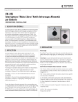 Di sposit i fs d ' Act i v a t i o n de P o r te CM-336 Interrupteurs "Mains Libres" Actifs Infrarouges Alimentés par Batterie INSTRUCTIONS D'INSTALLATION 1. DESCRIPTION GÉNÉRALE Les interrupteurs mains libres Sure-Wave™ sont des dispositifs actifs infrarouges utilisant la technologie de capteurs à microimpulsions, conçus pour être utilisés dans des applications de contrôle automatique de portes conformes à l'ADA. Ces interrupteurs éliminent la propagation des germes en évitant le contact physique et offrent aux occupants du bâtiment une plus grande commodité lorsqu'ils se déplacent dans les locaux. Les interrupteurs Sure-Wave™ sont disponibles avec des plaques frontales en acier inoxydable ou en polycarbonate résistant aux chocs, en configurations étroites (jambage), single gang ou double gang. Tous les modèles sont conformes ROHS avec une construction sans plomb. 3. INSTALLATION 2. APPLICATION Montage Les interrupteurs mains libres à piles Sure-Wave™ sont conformes à l'American Disability Act (ADA) et fournissent un accès sans obstacle aux bâtiments et aux installations sanitaires. Leur construction robuste les rend idéaux pour une utilisation sur des portes automatiques à faible énergie, des guichets de service au volant, ainsi que des portes intérieures et extérieures dans pratiquement n'importe quel établissement commercial (bureaux, vente au détail), institutionnel (école, hôpital ou clinique), ou industriel (fabrication). Sure-Wave™ peut être monté dans les montants de porte, les boîtes électriques single gang ou double gang, et les boîtes 4 x 4. Trois largeurs standard de plaques frontales sont disponibles : CM-336 : 2 ¾ po x 4 ½ po en polycarbonate ou en acier inoxydable, s'adapte sur des boîtes électriques single gang. CM-336/N : 1 ¾ po x 4 ½ po en polycarbonate ou en acier inoxydable. CM-336/W : 4 ½ po x 4 ½ po en polycarbonate ou en acier inoxydable, s'adapte sur single gang, double gang ou des boîtes électriques 4 x 4. Toutes les plaques frontales peuvent être commandées avec un visage simple, avec le symbole de la main qui fait signe (/40), avec le symbole de la main qui fait signe et les mots : WAVE TO OPEN (/41) ou avec le symbole de la main qui fait signe, les icônes de fauteuil roulant plus les mots : WAVE TO OPEN (/42). REMARQUE: Le joint d'étanchéité (inclus) est recommandé pour les emplacements extérieurs ou humides. Si utilisé avec des portes automatiques, installez conformément à ANSI A156.10 / A156.19. Sélectionnez l'une des trois sous-sections de montage suivantes : BOÎTE ÉLECTRIQUE SINGLE GANG : CM-336 1a - Si vous utilisez une boîte encastrée, assurez-vous qu'elle est d'aplomb et carrée, et à fleur avec la surface du mur. (Voir Diagramme 1) 1b - Si vous utilisez une boîte de surface, assurez-vous qu'elle est sécurisée et d'aplomb. 2 - À l'aide du commutateur à bascule situé à l'extrémité de l'appareil, réglez le mode de fonctionnement. (Voir Section 4) 3 - Fixez l'appareil à l'enceinte à l'aide des deux vis #6-32 fournies. 4 - Fixez la plaque frontale à l'appareil à l'aide des deux vis à machine noires #6-32 x 3/8 ou des vis inviolables. Ne pas trop serrer!! Page 1 de 4 CM-336 INTERRUPTEURS "MAINS LIBRES" ACTIFS INFRAROUGES ALIMENTÉS PAR BATTERIE I NSTRUCT IONS D'INSTAL LATION Schéma 1 – Installation correcte de la boîte Mur Installation correcte Finition du mur lisse Affleurant Boîte murale Installation incorrecte Finition du mur rugueuse Boîte en retrait Boîte désalignée 2- Boîte électrique DOUBLE GANG (ou 4x4) : CM336W 1a - Si vous utilisez une boîte encastrée, assurez-vous qu'elle est d'aplomb et carrée, et à fleur avec la surface du mur. (Voir Diagramme 1) 1b - Si vous utilisez une boîte de surface, assurez-vous qu'elle est sécurisée et d'aplomb. Appariement du CM-336 L'interrupteur sans fil SureWave™ CM-336 à piles utilise notre technologie Lazerpoint RF et est destiné à être utilisé avec les récepteurs Camden CM-RX90 V2, CM-RX91 ou CM-RX92 Lazerpoint. Pour appairer l'émetteur CM-336 à un récepteur, appuyez sur le bouton PB1 (ou PB2 sur le CM-RX92) sur le récepteur à l'aide d'un petit objet émoussé comme un petit tournevis à lame ou similaire. Dans les 10 secondes, agitez votre main devant le CM-336 pour l'activer. Le tableau de LED vert sur le récepteur clignotera une fois pour confirmer l'inscription. Répétez avec tous les autres interrupteurs sans fil Sure-wave™ CM-336. L'activation du CM-336 appairé de nouveau signalera au récepteur que vous avez terminé la programmation et les LED 1 & 2 clignoteront, en séquence alternée. L'activation du CM336 une troisième fois activera le relais du récepteur et la LED correspondante, ainsi que le dispositif connecté aux contacts du relais. Si vous attendez plus longtemps que la période de 10 secondes, le récepteur se déconnectera du mode d'appariement et reviendra en mode veille. La LED clignotera alors pour indiquer le nombre d'émetteurs appris par le récepteur. Câblage ATTENTION: Ne pas alimenter l'unité avant que tout le câblage ne soit terminé et que les commutateurs à bascule n'aient été réglés. Le CM-336 est alimenté par 2 piles AA (fournies). Le porte-piles a été pré-installé. Insérez les piles dans le porte-piles. Veuillez faire attention à ce que la polarité des piles soit correcte. 1c - Si vous utilisez une boîte 4 x 4, assurez-vous qu'elle est d'aplomb et carrée, et à fleur avec la surface du mur, puis fixez la plaque adaptatrice en métal (incluse dans le paquet CM336W) à la boîte à l'aide de fixations appropriées. 2 - Fixez l'appareil à l'enceinte à l'aide des deux vis #6-32 fournies. 3 - Fixez la plaque frontale à l'appareil à l'aide des deux vis à machine noires #6-32 x 3/8 ou des vis inviolables. Ne pas trop serrer !! Entrée de Demande de Sortie Page 2 de 4 + - CM-336 INTERRUPTEURS "MAINS LIBRES" ACTIFS INFRAROUGES ALIMENTÉS PAR BAT