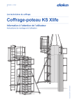 999746003 - 01/2022 fr Les techniciens du coffrage. Coffrage-poteau KS Xlife Information à l’attention de l’utilisateur Instructions de montage et d’utilisation 9746-300-01 © by Doka GmbH, A-3300 Amstetten © by Doka GmbH, A-3300 Amstetten Information à l’attention de l’utilisateur Coffrage-poteau KS Xlife 2 © by Doka GmbH, A-3300 Amstetten 999746003 - 01/2022 Information à l’attention de l’utilisateur Coffrage-poteau KS Xlife Sommaire 4 4 7 Introduction Informations essentielles de sécurité Services Doka 8 9 10 14 16 18 19 20 21 24 28 31 Description Domaines d’utilisation Montage du coffrage-poteau Coffrage / décoffrage Translation Modifier la section de poteaux Contreventement Réalisation de passerelle avec la plate-forme KS Système d’accès XS sur la plate-forme KS Formation de passerelle avec passerelle Doka 150/90cm Système d’accès XS sur passerelle Doka 150/90cm Transport, gerbage et stockage 36 Liste des articles 999746003 - 01/2022 © by Doka GmbH, A-3300 Amstetten 3 Introduction Information à l’attention de l’utilisateur Coffrage-poteau KS Xlife Introduction Informations essentielles de sécurité Groupes d’utilisateurs ▪ Ce document s’adresse à toute personne amenée à travailler avec le produit/système Doka décrit et contient des renseignements relatifs au montage et à l’utilisation du système, conformes aux directives. ▪ Toutes les personnes qui travaillent avec ces différents produits doivent connaître parfaitement le contenu de ces documents et leurs informations relatives à la sécurité. ▪ Le client doit informer et former les personnes qui ont des difficultés à lire et à comprendre ces documents. ▪ Le client doit s’assurer que les informations (comme les informations à l’attention de l’utilisateur, les instructions de montage et d’utilisation, les notices techniques, les plans etc.), mises à disposition par Doka sont disponibles et actuelles, qu’elles ont fait l’objet d’une présentation et qu’elles sont à la disposition des utilisateurs sur le lieu d’utilisation. ▪ Doka présente sur les illustrations de sa documentation technique et sur les plans de mise en oeuvre des coffrages correspondants, des mesures de sécurité au travail garantissant une sûreté maximale dans l’utilisation des produits Doka dans les applications décrites. En toutes circonstances, l’utilisateur s’engage à respecter les lois, les normes et les réglementations en vigueur dans le pays concerné, pour l’ensemble du projet et à prendre, si nécessaire, d’autres mesures ou des mesures complémentaires appropriées de sécurité au travail. Évaluation du risque ▪ Le client est responsable de l'établissement, de la documentation, de l'application et de la révision d’une évaluation du risque sur le chantier. Le présent document sert de base à l’évaluation du risque spécifique à chaque chantier et aux instructions de mise à disposition et d’application du système par l’utilisateur. Il ne remplace cependant pas ces instructions. 4 © by Doka GmbH, A-3300 Amstetten Remarques relatives à ces documents ▪ Le présent document peut également servir d’ins- tructions de montage et d’utilisation applicables en général ou être intégré à des instructions de montage et d’utilisation spécifiques à un chantier. ▪ Les représentations, animations et vidéos de cette brochure ou appli peuvent montrer des situations de montage partiel et ne sont donc pas toujours complètes en matière de sécurité. Pour se conformer aux prescriptions en vigueur, le client doit utiliser certains dispositifs de sécurité qui ne sont pas toujours représentés sur ces illustrations, animations et vidéos. ▪ D’autres conseils de sécurité et des mises en garde particulières sont développés dans les chapitres suivants. Études ▪ Prévoir pour la mise en oeuvre des coffrages des postes de travail répondant à toutes les normes de sécurité (par ex. : pour le montage et le démontage, les travaux de modification et lors de la translation, etc.). L’accès aux postes de travail doit se faire en toute sécurité. ▪ Toute divergence par rapport aux indications portées sur ces documents ou application supplémentaire nécessite des documents justificatifs statiques spécifiques et des instructions complémentaires de montage. Dispositions / Protection du travail ▪ Pour que nos produits soient utilisés en toute sécu- rité, il est indispensable de respecter les lois, les normes et les réglementations en vigueur dans les différents états et pays, relatives à la protection du travail et aux autres directives de sécurité dans leur version en vigueur. ▪ En cas de chute d’une personne ou d’un objet contre ou sur le garde-corps latéral ou ses accessoires, toute réutilisation de cet élément de garde-corps est uniquement autorisée après vérification par une personne compétente. 999746003 - 01/2022 Information à l’attention de l’utilisateur Coffrage-poteau KS Xlife Mesures s’appliquant à toutes les phases d’utilisation ▪ Le client doit s’assurer que le montage et le démon- tage, la translation, tout comme l’utilisation du produit sont effectués conformément aux directives et inspectés par du personnel techniquement qualifié et habilité selon les consignes. La capacité d’intervention de ce personnel ne doit pas être diminuée par la prise d’alcool, de médicaments ou de drogues. ▪ Les produits Doka sont des outils de travail techniques dont l'utilisation est réservée à un cadre industriel, conformément aux informations à l’attention de l’utilisateur Doka correspondantes ou aux autres documents techniques rédigés par Doka. ▪ S’assurer de la stabilité statique et de la force portante de l’ensemble de la construction et des éléments à chaque stade du montage ! ▪ Les porte-à faux, compensations, etc., ne doivent être pratiqués