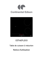Vous trouverez ci-dessous de brèves informations pour CETI4FLEX3. Cette table de cuisson à induction est destinée à une utilisation domestique exclusive. Elle est dotée de zones de cuisson, d'un minuteur, de fonctions de sécurité enfant, d'une fonction booster pour une montée en température rapide et un mode pause pour interrompre temporairement la cuisson.