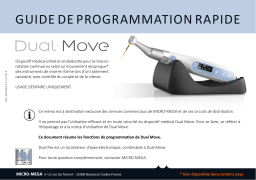 Vous trouverez ci-dessous de brèves informations pour Dual Move. Ce dispositif médical est utilisé en endodontie pour la mise en rotation continue ou selon un mouvement réciproque des instruments lors d'un traitement canalaire, avec contrôle du couple et de la vitesse. Ce guide résume les fonctions de programmation incluant les réglages des programmes utilisateur et les fonctions avancées en mode combiné avec Dual Pex.
