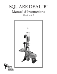 Vous trouverez ci-dessous de brèves informations sur Square Deal B. Ce manuel d'instructions vous guide dans le montage, l'utilisation et l'entretien de votre presse de rechargement Square Deal B. Apprenez à recharger vos munitions en toute sécurité et efficacement, en utilisant les différentes stations pour le recalibrage, l'amorçage, la distribution de poudre, le placement de la balle et le sertissage. Assurez-vous d'utiliser l'équipement de protection approprié et de suivre les instructions attentivement.