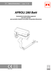 Vous trouverez ci-dessous de brèves informations sur APROLI 280 Batt. Cet automatisme hydraulique apparent avec bras articulé est conçu pour l'ouverture et la fermeture de portails à battant avec des piliers de grandes dimensions. Il offre une installation facile, des mouvements fluides et une force de poussée réglable pour s'adapter à différents types de portails.