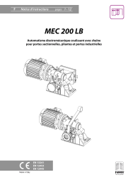 Vous trouverez ci-dessous de brèves informations sur le MEC 200 LB. Cet automatisme est conçu pour une utilisation avec des portes sectionnelles, pliantes et industrielles. Il est disponible en plusieurs versions selon la surface de la porte et propose un déverrouillage manuel par levier ou câble. Des fins de course intégrés ou externes sont disponibles pour une gestion précise du mouvement de la porte.