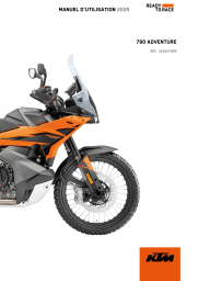 Vous trouverez ci-dessous de brèves informations sur les modèles 790 ADVENTURE, 790 ADVENTURE D.D. Cette moto est conçue pour l'aventure, offrant une expérience de conduite polyvalente sur route et hors route. Elle est équipée d'éléments de commande intuitifs, d'un tableau de bord informatif et de réglages ergonomiques pour un confort optimal. Découvrez les consignes de sécurité, les conseils d'utilisation et les instructions d'entretien pour profiter pleinement de votre KTM.