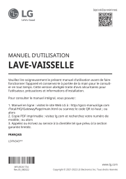 Vous trouverez ci-dessous de brèves informations pour LDFN343**. Ce manuel d'utilisation pour lave-vaisselle LG LDFN343** fournit des informations importantes sur la sécurité, des précautions et des instructions d'installation. Il inclut également l'aperçu du produit, le fonctionnement, les fonctions intelligentes, l'entretien et le dépannage. Vous pouvez également le consulter en ligne, télécharger une version PDF ou contacter le service client.