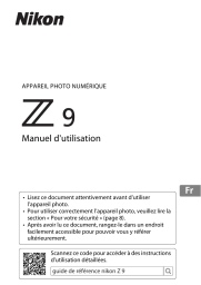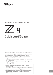 Ci-dessous vous trouverez de brèves informations pour Z 9. Ce manuel vous guide à travers les opérations de base de l'appareil photo, incluant fixation de la courroie, chargement de l'accumulateur, insertion des cartes mémoire et fixation d'un objectif. Vous apprendrez à configurer l'appareil, prendre des photos et réaliser des vidéos.