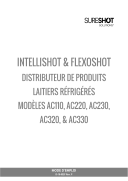 Vous trouverez ci-dessous de brèves informations pour AC110, AC220, AC230, AC320 et AC330. Ce manuel couvre l'installation, le fonctionnement et la maintenance des distributeurs de produits laitiers réfrigérés IntelliShot et FlexoShot. Les informations fournies incluent des conseils sur la préparation du distributeur, l'installation du produit (sacs pré-remplis, caisse-outre, réservoir rechargeable), la distribution du produit et le nettoyage. De plus, il détaille les fonctions logicielles spécifiques aux modèles à portion contrôlée, y compris l'ajustement des recettes et l'étalonnage.